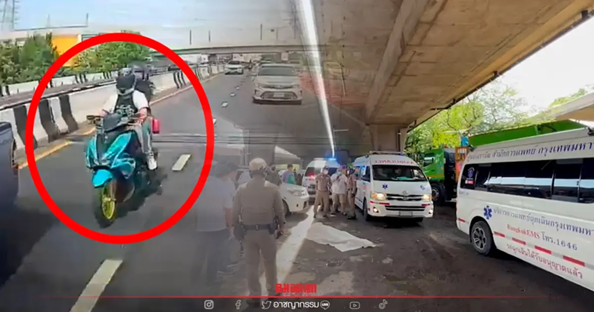สอบถามคนบาดเจ็บ ทราบว่า ขณะขับรถอยู่บนทางยกระดับได้มีรถกระบะ เกิดเบรกกะทันหันทำให้ พุ่งชนท้าย ก่อนจะกระเด็นตกลงมาทั้งคู่ จากการตรวจสอบกล้องวงจรปิดของพลเมืองดี ปรากฎภาพรถจักรยานยนต์คันเกิดเหตุขับมาช่องทางด้านขวา ก่อนจะเห็นว่าขับแซงรถของพลเมืองดีขึ้นไปด้านขวา