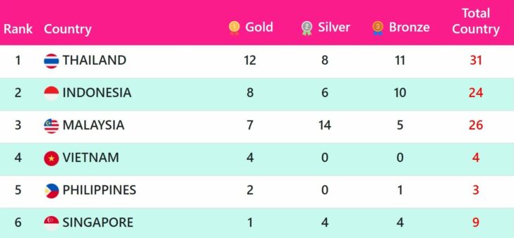 จากผลงาน 9 เหรียญทองในวันเดียว ทำให้ไทยยึดผู้นำฝูงในตารางเหรียญต่อเป็นวันที่สองต่อเนื่องกัน ผลงาน 12 เหรียญทอง 8 เหรียญเงิน 11 เหรียญทองแดง โดยมีอินโดนีเซียตามมาเป็นชั้น 2 ที่ 8 เหรียญทอง และก็ชั้น 3 เป็นมาเลเซีย 7 เหรียญทอง
