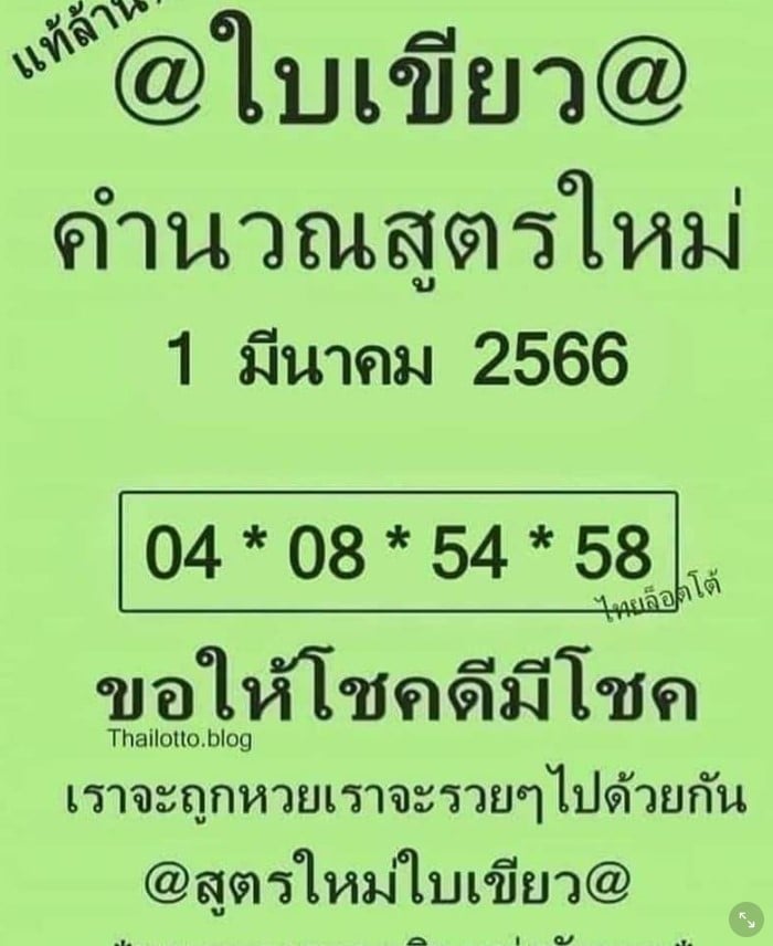 งานนี้ใครที่ยังไม่ได้ซื้อลอตเตอรี่อย่ารอช้า รีบไปหาซื้อเลขเด็ดจาก หวยใบเขียว 1/3/66 มาเก็บไว้เป็นการด่วน เพราะหลายคนเชื่อว่า อาจมีลุ้นให้โชควันประกาศผลสลากกินแบ่งรัฐบาลงวดนี้แน่นอน