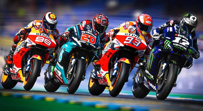 Moto GP การแข่งขันที่ใช้รถจักรยานยนต์เครื่องยนต์ 4 จังหวะ 1000cc 4 สูบ เครื่องยนต์ที่ใช้จะเป็นเครื่อง V ซึ่งเป็นเครื่องยนต์ที่ออกแบบมาให้วางทำมุมกันราว ๆ 45 องศา โดยวัดจากแนวตั้งฉากของแนวชักลูกสูบ ซึ่งมีการจุดระเบิดกันตามมุมองศา และรอบเครื่องตามที่ผู้ผลิตแต่ละเจ้าออกแบบมา หรือเครื่อง In-Line ที่เป็นเครื่องยนต์แบบกระบอกสูบเรียง