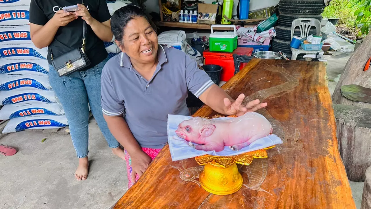 ก่อนที่จะลูกหมูแปลกจะคลอดออกมา ตนกับผัวเฝ้าหมูทุกๆวันภายหลังแม่หมูใกล้จะออกลูก เมื่อถึงวันระบุเป็นวันที่ 29 พ.ค. 2566 แม่หมูก็ได้กำเนิดลูกออกมาปริมาณ 2 ตัว ตนแล้วก็แฟนไม่ว่างก็เลยออกไปด้านนอก กลับเข้ามาในบ้านอีกครั้งตอนเวลาค่ำ เวลา 20.30 น. เจอลูกหมูคลอดออกมาร่วมกันทั้งหมดทั้งปวง 8 ตัว แล้วก็ตัวที่มีงวงยื่นออกมาราวกับช้างนั้น คลอดออกมาเป็นตัวที่ 7 ตนมีความเห็นว่ายังมีชีวิตอยู่ ก็เลยพากันเอามาอุปถัมภ์ค้ำชูที่บ้าน ด้วยเหตุว่าเกรงว่าถ้าหากปลดปล่อยไว้กับแม่หมู แม่จะเหยียบดวงตาย