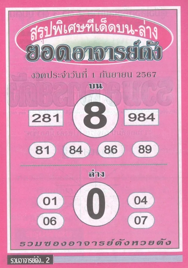 หวยยอดอาจารย์ดัง 1/9/67 อัพเดทหวยซองเข้าทุกงวด ดูเลขเด็ดยอดอาจารย์ดัง แนวทางหวยสลากกินแบ่งรัฐบาล จากหวยซองยอดอาจารย์ดัง มาพร้อมกับเลขท้าย 3 ตัว และ 2 ตัว สรุปพิเศษทีเด็ดบน-ล่าง หวยยอดอาจารย์ดัง