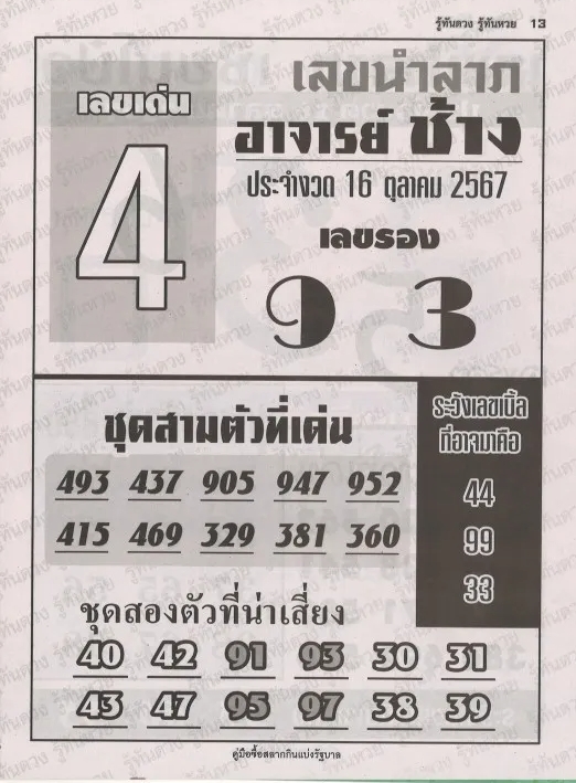 หวยอาจารย์ช้าง 16/10/67 ชุดเลขเด่นน่าสนใจ ดูเลขเด็ดอาจารย์ช้าง มาพร้อมกับชุดเลข 3 ตัว และ 2 ตัว เลขเด่น-เลขรอง สรุปหวยซองดังมาแรง จากสำนักหวยอาจารย์ช้างงวดนี้ แนวทางหวยสลากกินแบ่งรัฐบาล วิเคราะห์หวยเด็ดอาจารย์เข้าทุกงวด
