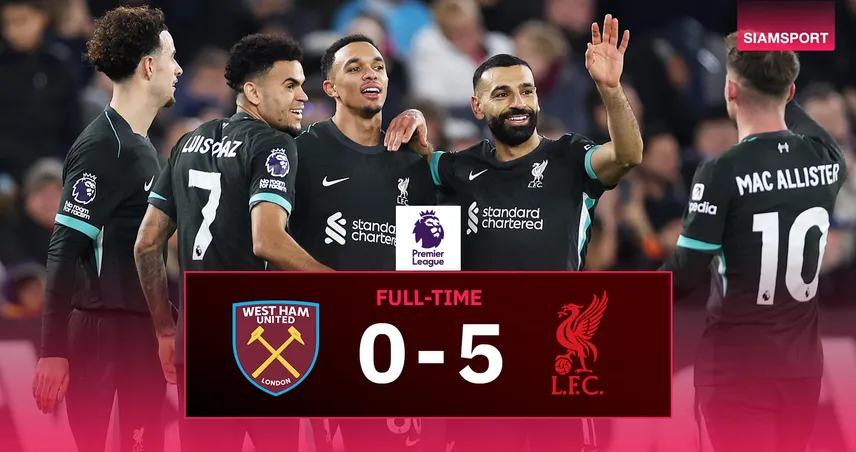 โมฮาเหม็ด ซาลาห์ ยิงหนึ่งจ่ายสอง ลิเวอร์พูล บุกถล่ม เวสต์แฮม 5-0 "หงส์แดง" ไร้พ่าย 23 นัดติดทุกรายการนำจ่าฝูงที่ 45 คะแนน นัดหน้ารอรับ แมนยู ศึกแดงเดือดหนที่สองของซีซั่น