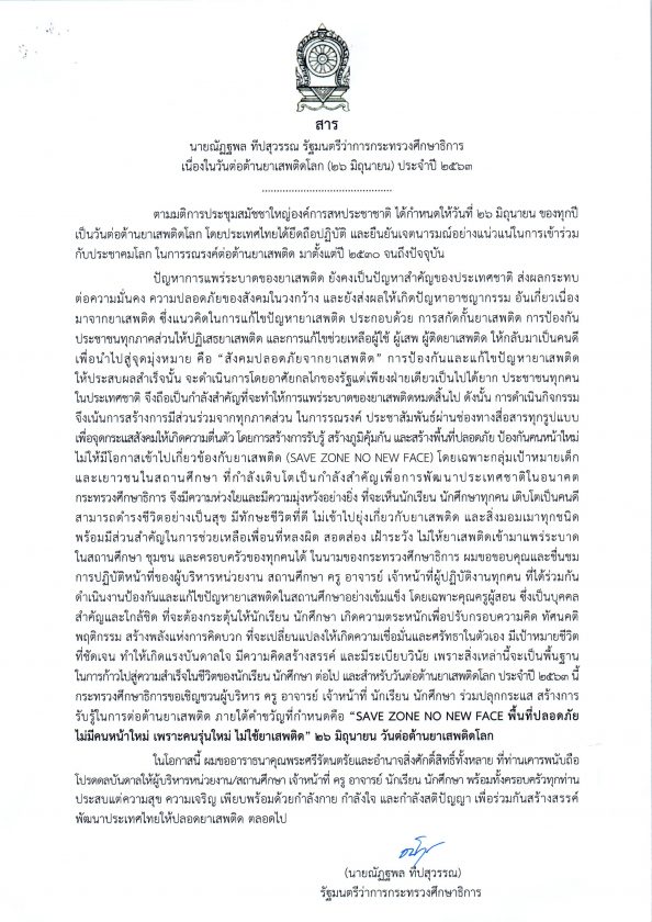 สาร นายณัฎฐพล ทีปสุวรรณ รัฐมนตรีว่าการกระทรวงศึกษาธิการ เนื่องในวันต่อต้านยาเสพติดโลก ประจำปี 2563